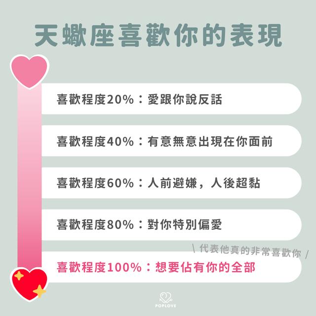 天蝎座是个非常傲娇的星座,一开始为了想隐藏自己的心意,会很爱跟你唱反调跟故意和你意见不合,其实是为了想要增加跟你的互动,等到越来越喜欢你之后,他们的占有欲就会赤裸裸地展现出来,而且他们也不避讳让其他人知道,因为某方面他们是故意这样,想让大家知道你是他的,谁都不许碰!