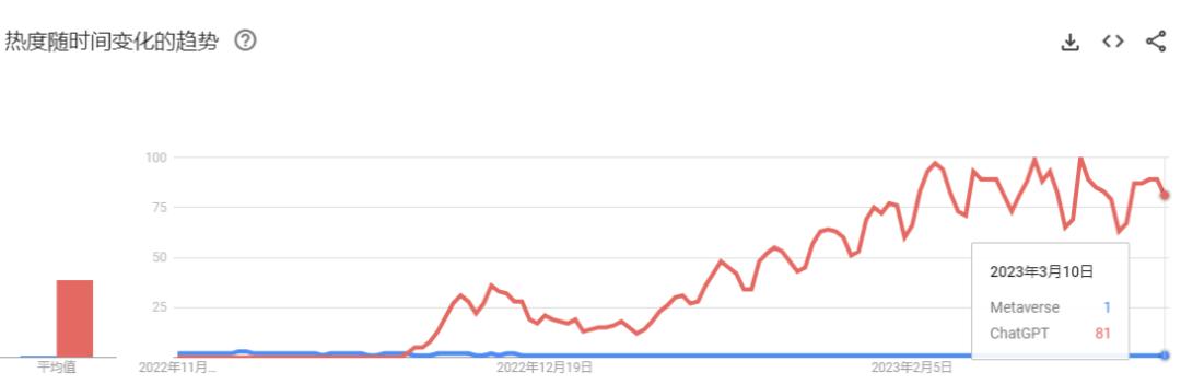 图 元宇宙(Metaverse)与ChatGPT的搜索热度比较(2022年11月至今)