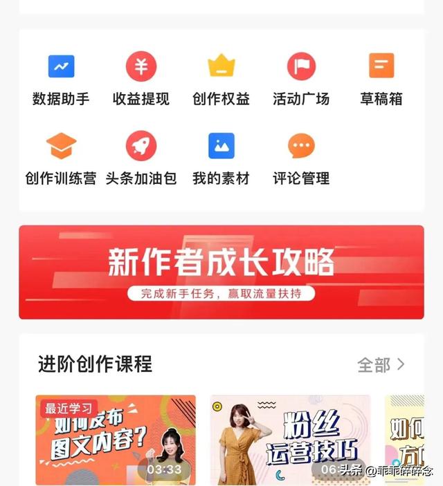 新人小白一定要进入训练营学习头条公开课,这是自媒体之路的第一步。课程包括 :创作技巧,账号运营,变现攻略,新手入门四大类。课程很全面,微头条,文章,视频都有相应的介绍和讲解。耐心学完相关课程,对头条的运行机制及如何创作做到心中有数,不会迷茫。