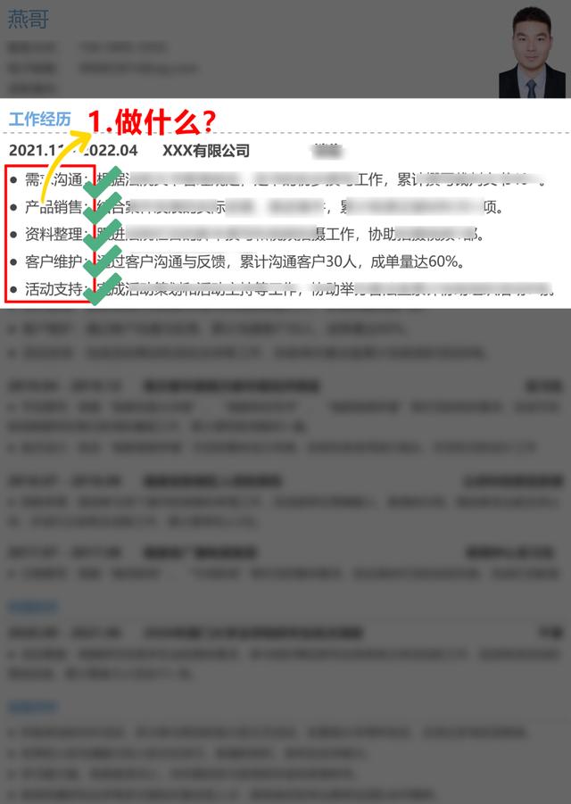 第一,做什么 就是找出每段工作经历里的工作内容点,一般找出5个左右的核心工作内容就可以了。如这位求职者的销售工作经历,就找到了:需求沟通、产品销售、资料整理、客户维护、活动支持 5个工作内容点。
