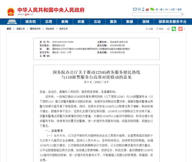 2022年5月16日,国务院办公厅发布《国务院办公厅推动12345政务服务便民热线与110报警服务台高效对接联动的意见》,提出: