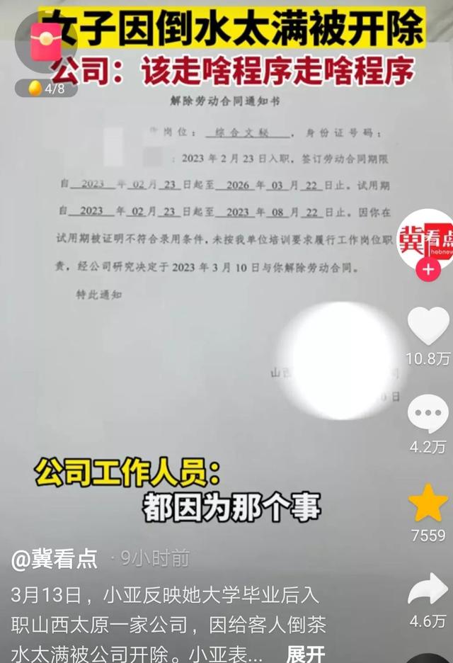 3月13日,山西太原某教育公司,尚在实习期的综合文秘小亚给客人倒了一杯水,公司认为水倒的太满,引起客人不悦,于是通知她解除劳动合同,出具了正式的解除劳动合同通知书。且给出了解除原因,因其在试用期间被证明不符合录用条件。小亚自觉委屈,申辩说水离着杯口有一两厘米,绝对没有溢出来。她决定申请劳动仲裁,维护自身合法权益。截止目前,当地人社还没有发声。(本文信息内容及文所附图片来源于:冀看点,是河北日报河北新闻网官号。)