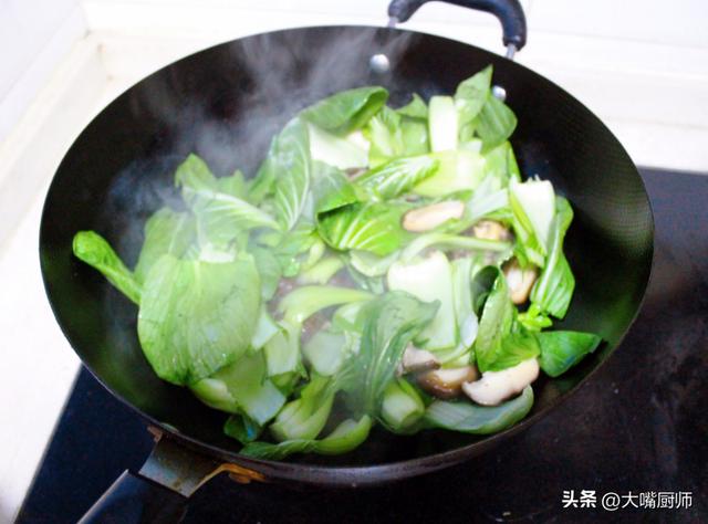 1、油菜、香菇洗干净,油菜切掉根部,香菇切块。起锅烧水,放入一勺盐、半勺油,先下入油菜煮1分钟,捞出沥干水分;再放入香菇煮1分钟,捞出沥干。