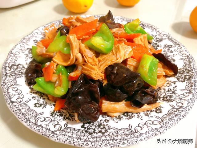 1、胡萝卜去皮洗干净,切成薄片。青椒去蒂去籽,洗干净后切块,腐竹、黑木耳提前浸泡4个小时,泡发后洗干净,腐竹切段,木耳撕成大块。葱姜蒜切末。