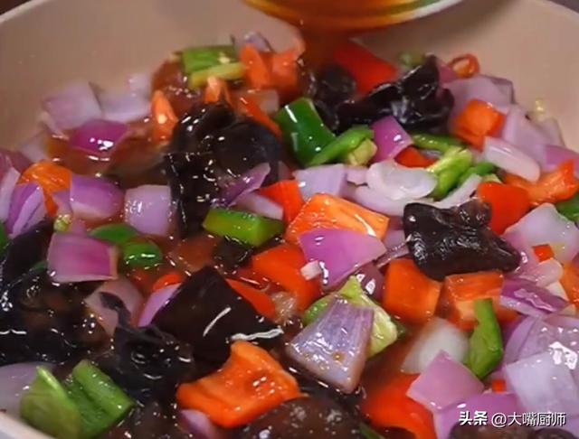 1、碗里加入食盐、生抽、蚝油、鸡精、淀粉、清水,搅拌均匀备用。洋葱洗干净后切块、青红椒洗净切块,黑木耳提前泡发,洗干净后撕成大块。葱蒜切末,小米椒切圈。