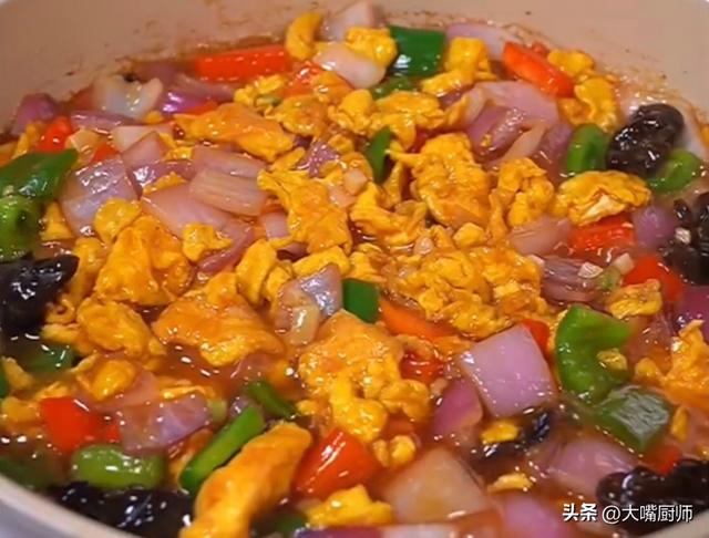 3、洋葱断生后,倒入碗里的料汁,放入炒好的鸡蛋块,大火翻炒均匀后收汁,汤汁浓郁后撒上葱花、小米椒,炒匀后即可出锅。