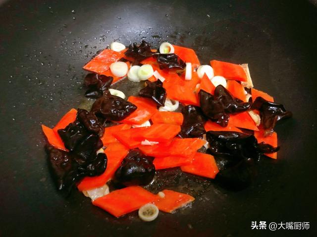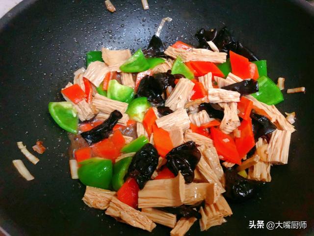3、起锅烧油,下入葱姜蒜爆香,倒入腐竹、木耳、青椒、胡萝卜,大火翻炒1分钟,淋入碗里的料汁翻炒均匀,开大火收汁,汤汁浓郁后即可出锅。