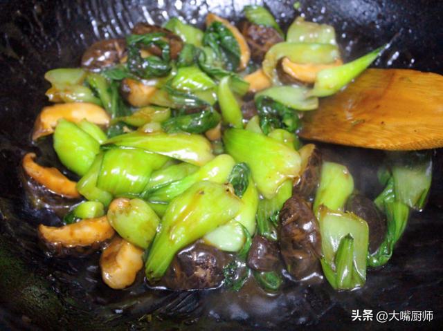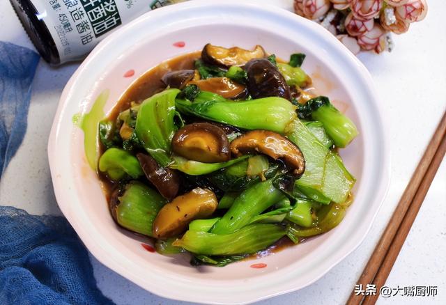 准备油菜、香菇、香葱、蒜瓣、食盐、生抽、老抽、蚝油、料酒、白糖、胡椒粉、淀粉、食用油。