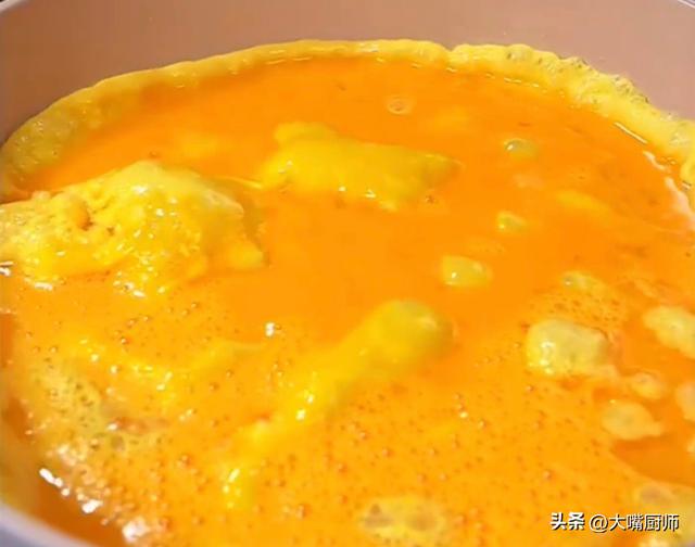2、鸡蛋打入碗中,用筷子搅散。起锅烧油,油要多一点,八成热时倒入鸡蛋液,大火煎熟后炒成大块盛出。锅里留底油,下入蒜末爆香,倒入青红椒、洋葱大火翻炒1分钟。