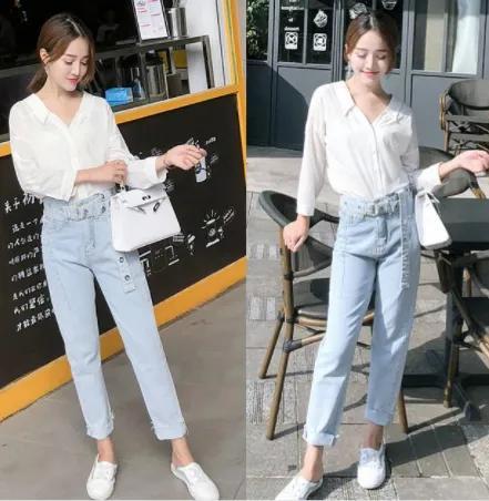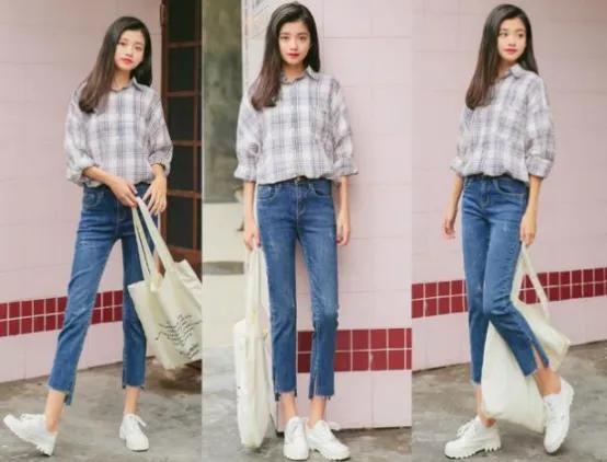 腿粗的女孩子搭配一条小脚牛仔裤,锥形的款式简约又利落。