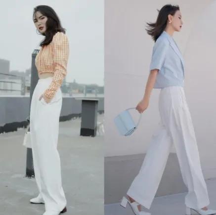 基础款的小白裤和小黑裤和衬衫一样都是简约风格的单品,非常适合于打造通勤休闲的春季造型。