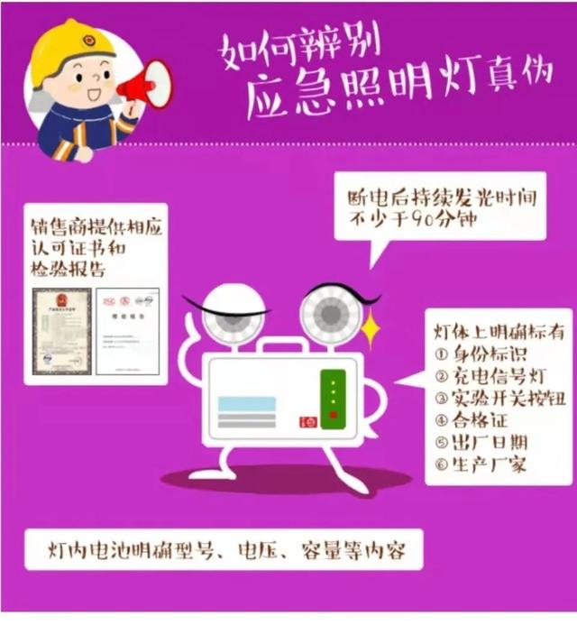 2.里外一致很重要:合格的产品在灯体上要有消防产品身份证标识、充电信号灯、实验开关按钮、合格证、出厂日期以及生产厂家名称和相关的技术参数。灯内所用电池应明确标注型号、电压、容量等内容,且应和该产品的检验报告相符。如果没有这些内容或者与检验报告不符则为不合格消防产品。正规的消防器材产品表面及包装上有清晰、耐久的标志,包括产品标志和质量检验标志。