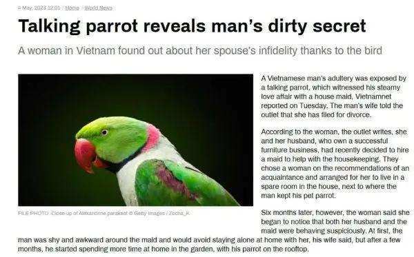 近日,一只宠物鹦鹉在越南登上了热搜。据报道,该鹦鹉成功地帮助女主人找到丈夫与家佣的出轨证据,这也导致女主人已经提出离婚申请。