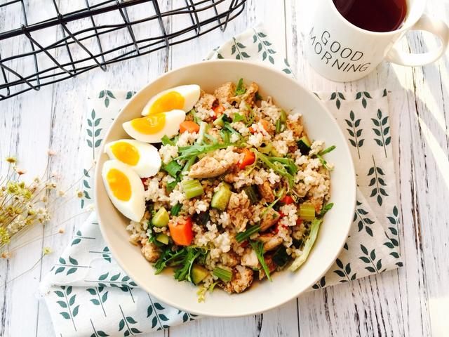 – 蒸鸡肉配上炒蔬菜和糙米。