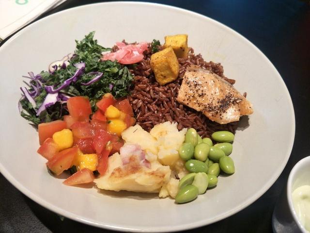 – 沙拉配上鲑鱼、坚果、水果和油醋酱。