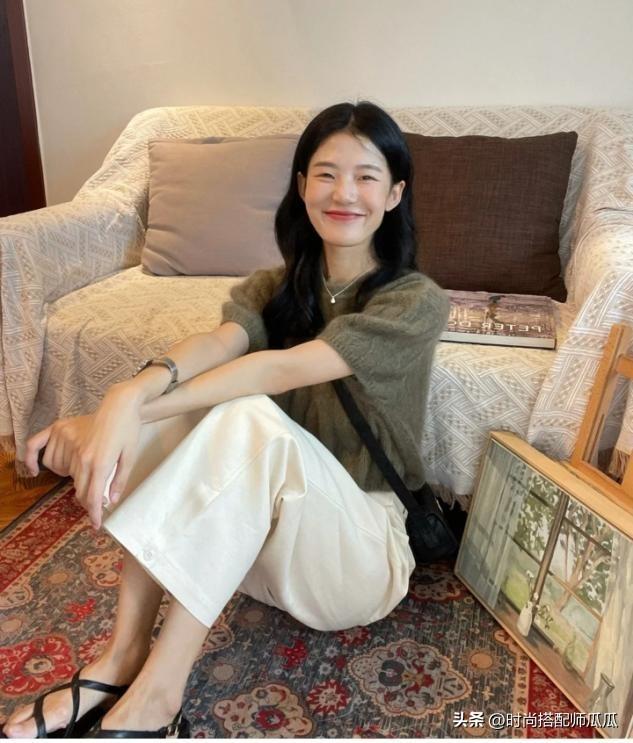 而到了夏天,追求清凉舒适感的穿搭当然要选择短袖上衣了,一件纯白色的T恤搭配杏裤,一样可以穿出色系的调和效果,温柔的风格非常的养眼。