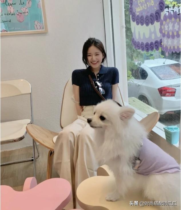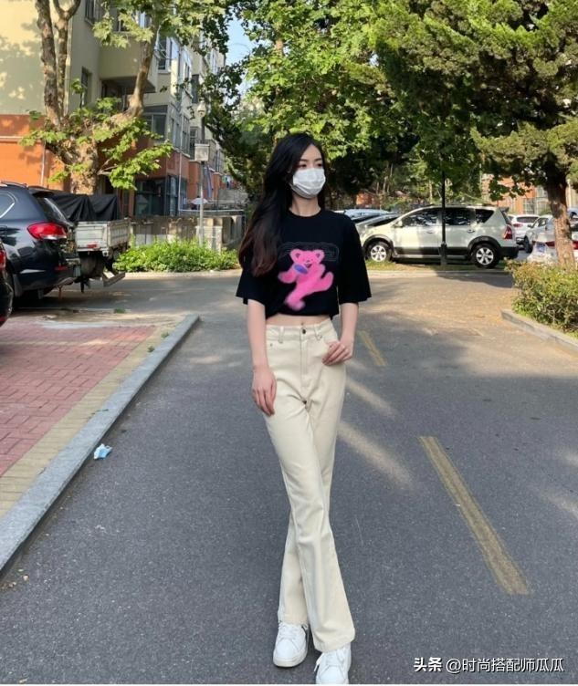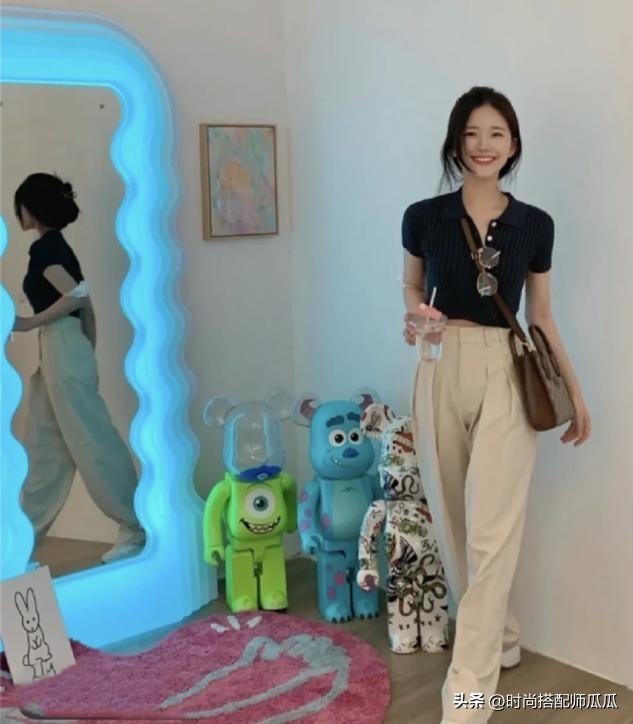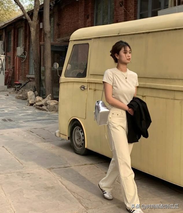 另外一种比较休闲又适合日常通勤的打扮,是T恤搭配杏裤,短款的T恤选择遮过肚脐的长度即可,在视觉感上可以打造出上半身视觉的占比,缩减效果瞬间达到拉长腿型的精彩穿搭视觉感。