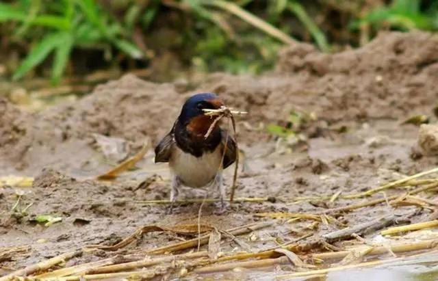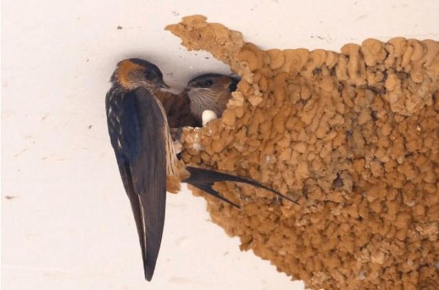 其他鸟类基本都是用树枝、野草等筑巢,燕子则与众不同,它们筑巢的原料主要是泥土,其间混着杂草,以提高鸟巢强度。泥土搭起鸟巢的基本架构之后,内部填充软物,确保自己和后代住得舒服。