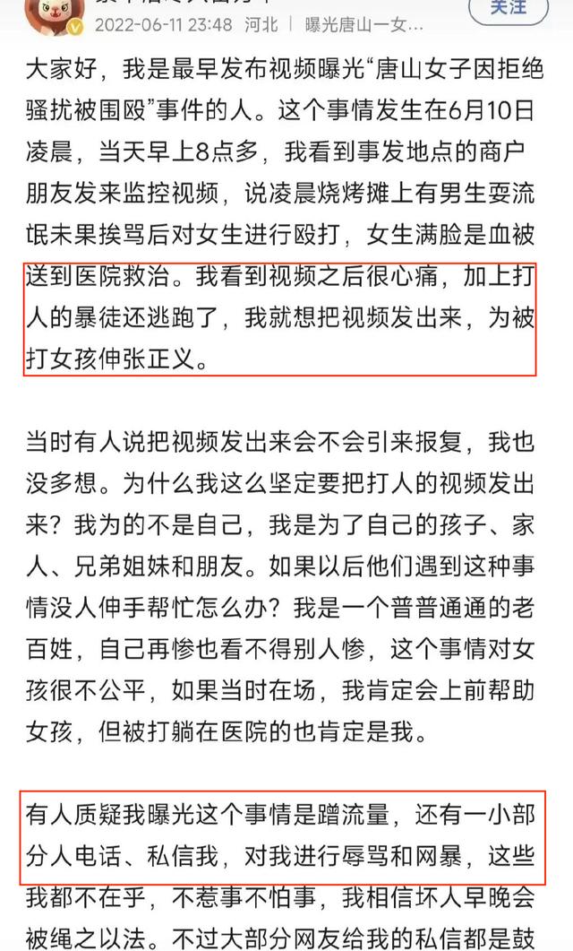 最先也是最不该承受这场风暴的,就是最早发布视频,曝光“唐山打人事件”这一恶行的爆料者。