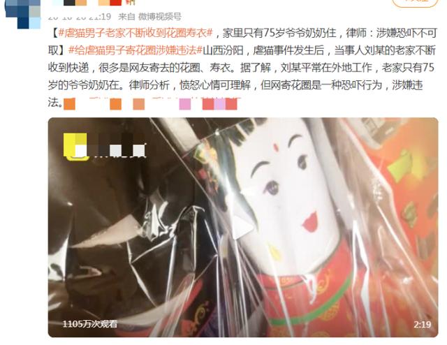 虐猫事件,当事人被惩罚之后,依然还有人波及家人,给年迈的老人寄去花圈、寿衣……