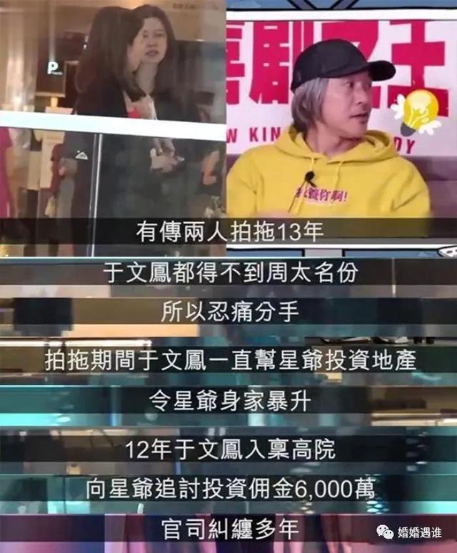 当周星驰陷入低谷,借酒消愁时,朋友正巧介绍于文凤给他,在影迷于文凤的支持下,周星驰身价猛涨,他俩也经常被港媒拍到一起出入,俨然一副老夫老妻的样子。
