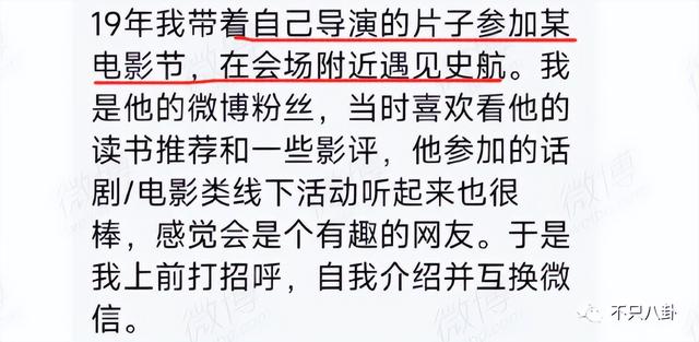 在她的描述中,她和史航见面是在2019年的某电影节,女孩是史航粉丝,于是就互相加了微信。