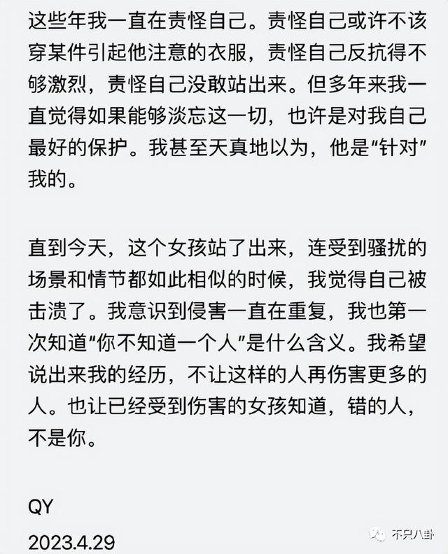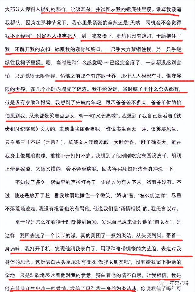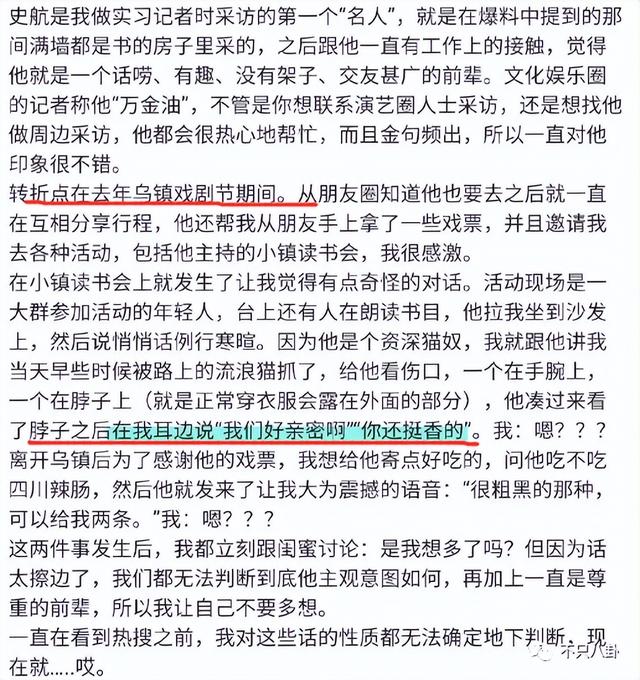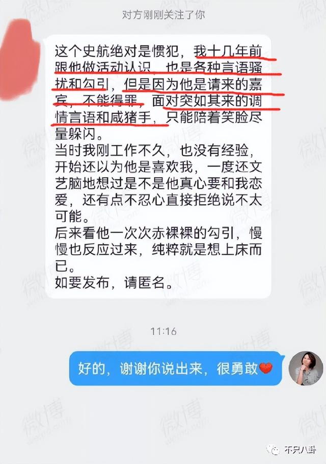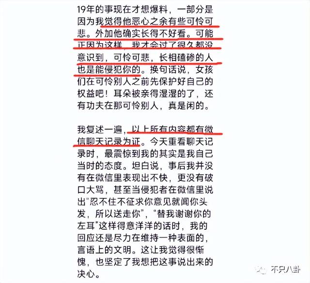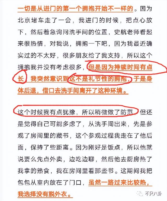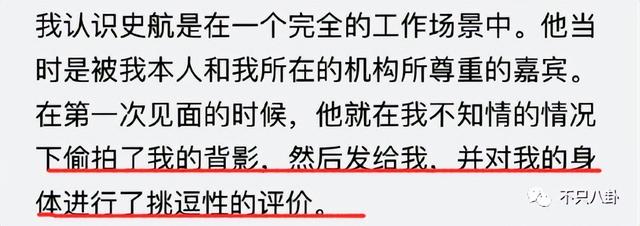 至于为啥女孩现在才想起来爆料,她说当时恶心之余,觉得史航很可怜可悲,再加上史航长得不好看,她过了很久都没意识到,长相磕碜的人也是能侵犯人的。