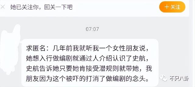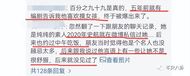 有接触史航所在圈子的人说,几年前就听说过史航行为不检点。有网友爆料说,史航曾告诉她的女性朋友,只要肯接受潜规则就带着进入编剧行业。
