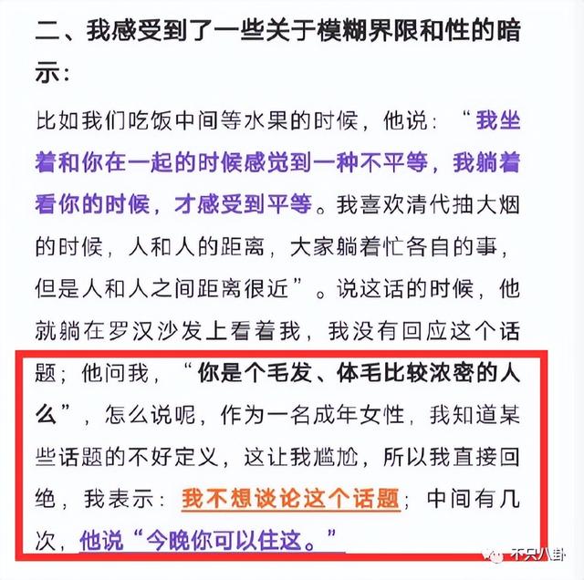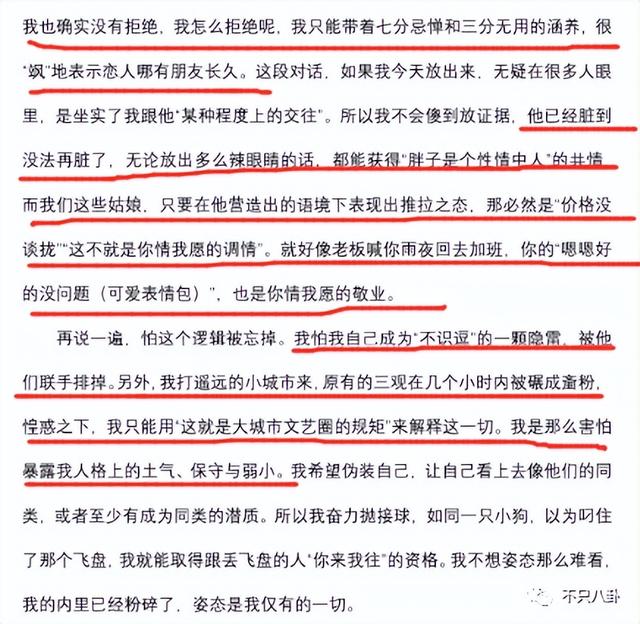 女孩表示,自己是小地方来的,她很不舒服,但也疑惑这会不会是史航这个圈子逗趣的一种方式,如果自己“不识逗”这点被史航说出去,那她是不是在这行就没办法混下去了。
