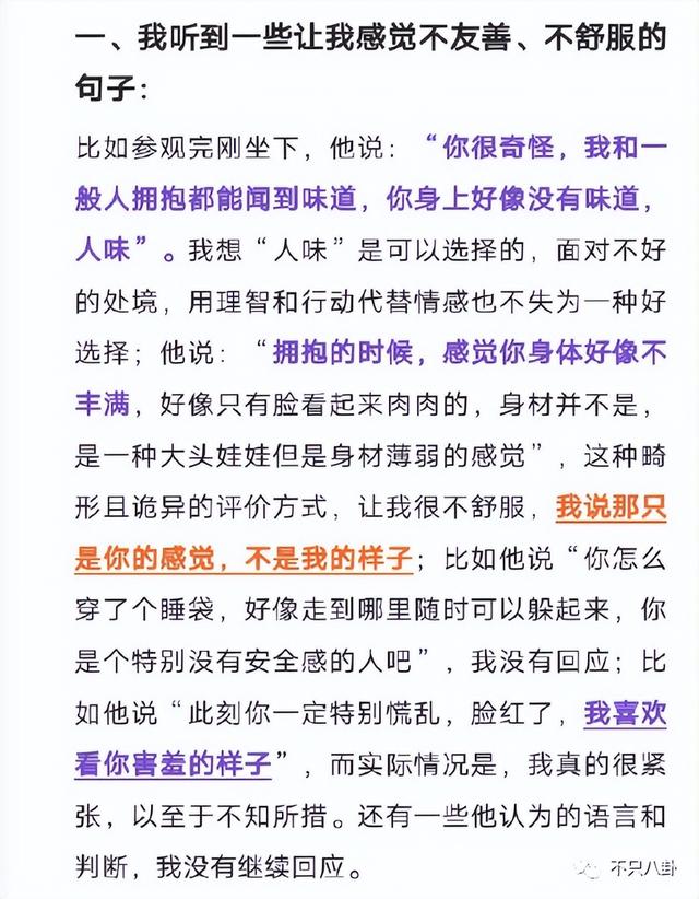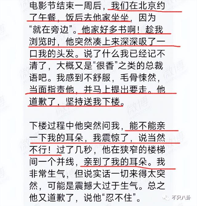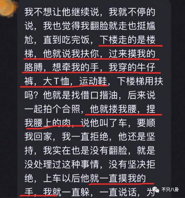 女孩感觉不适,立马指责并表示要走,史航道歉后要送女孩下楼,结果就在下楼的过程中他竟然在女孩明确拒绝的情况下,亲了人家的耳朵!!!!!