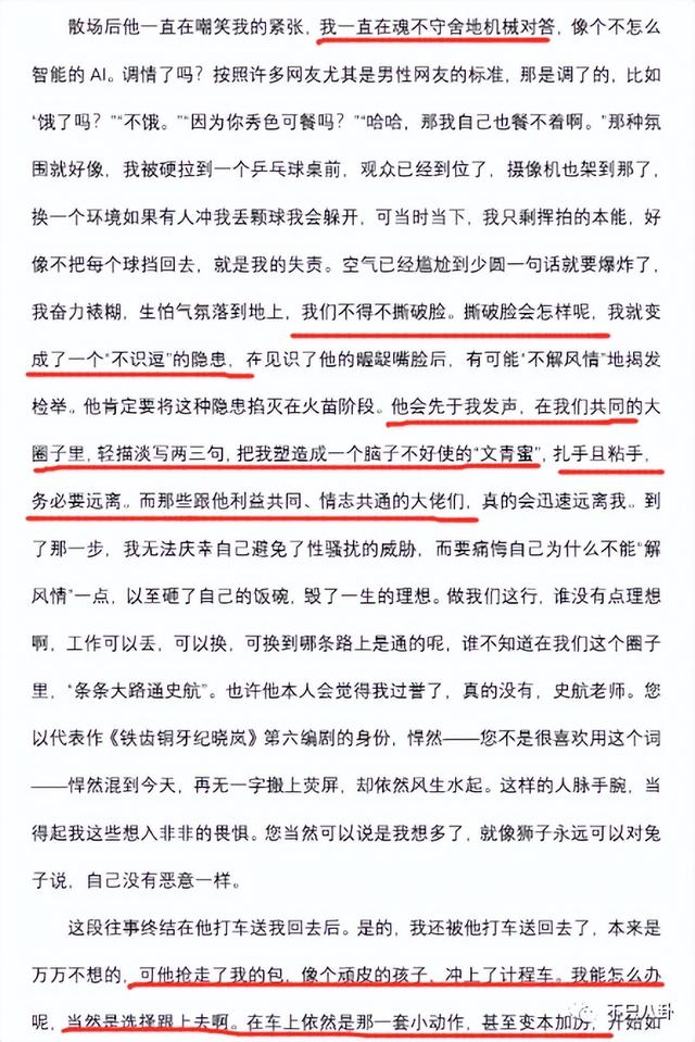 这位女孩就是如此,她努力想要融入史航所在的圈子和行业,其形容她就像一只小狗,以为叼住那个飞盘,就能和丢飞盘的人你来我往。在遭到史航性骚扰后,还是客气的和对方说话,只是不想姿态那么难看,害怕暴露人格上的土气、保守和弱小。