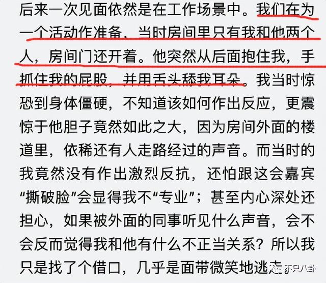 被史航性骚扰的时间在2018年,同样是“亲耳朵”,两人是因工作相识,史航是他们请来的嘉宾。结果史航先是对她言语挑逗,评论她的身材,接着在两人单独相处但门房开着的情况下,对女孩伸出咸猪手,抓女孩屁股并用舌头舔女孩耳朵