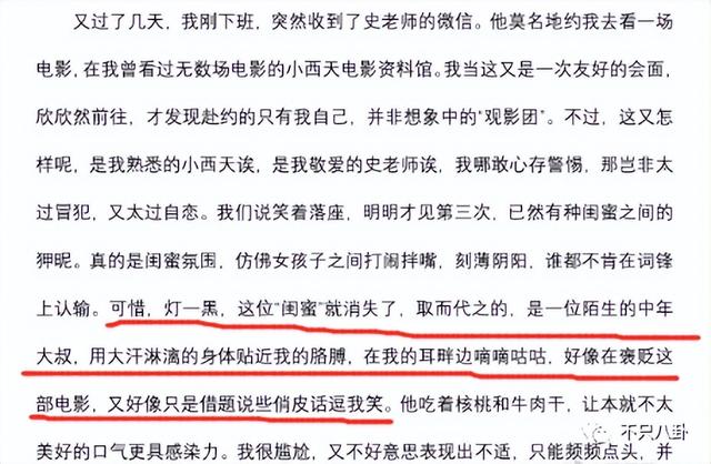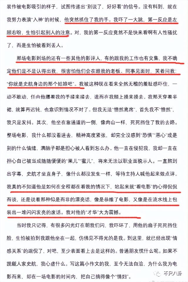 这位女孩当时莫名心里生出一种羞耻感,觉得对方是圈内前辈,如果她闹起来引起注意,会不会被同行误认为“她是史航身边的姑娘”,被认识的人认为是随随便便给中年大叔当“果儿”的女孩?