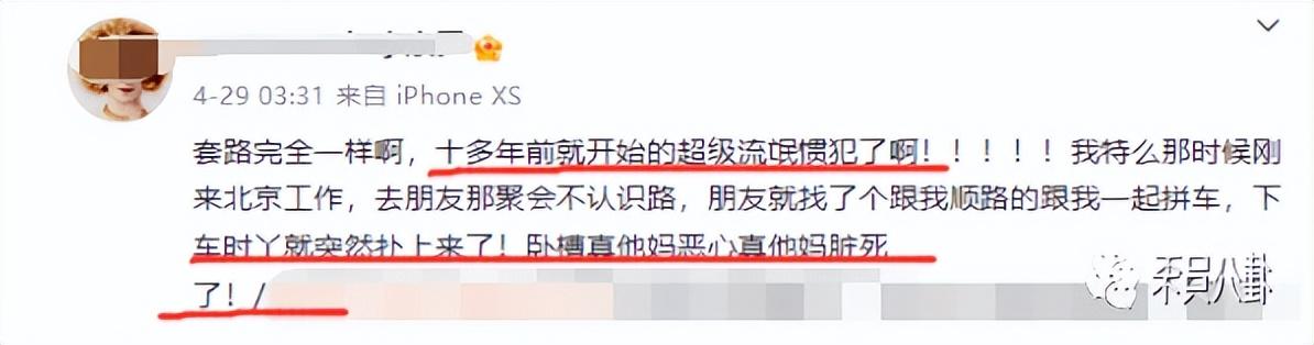 事情发生在十多年前,因聚会后坐史航顺风车,被对方突袭,女孩形容“下车时丫就突然扑上来”、“真恶心、真脏死了”……