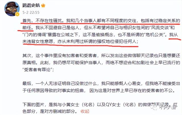 5月2日晚,史航再次发文,称自己不存在性骚扰,更表示他和几位发声的女当事人都有不同程度的交往,包括有过稳定关系的前任。