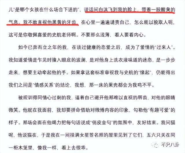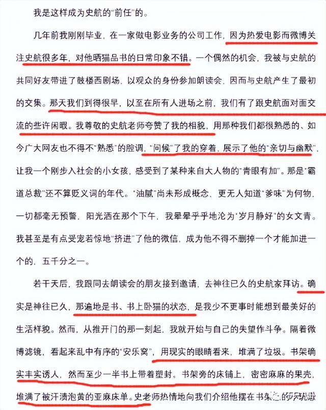 两人在朗读会认识,史航夸赞了她的相貌,“问候”了她的穿着,并加了微信。(人和人相处是复杂的,当被偶像夸赞好看,即便是对方稍有言语不妥,暂且忽视,是可以理解的)