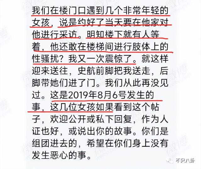 如果一个人说史航性骚扰,或许还能等一等看看到底怎么回事,可就在这位女孩爆料后,指控史航性骚扰的女孩子越来越多了。