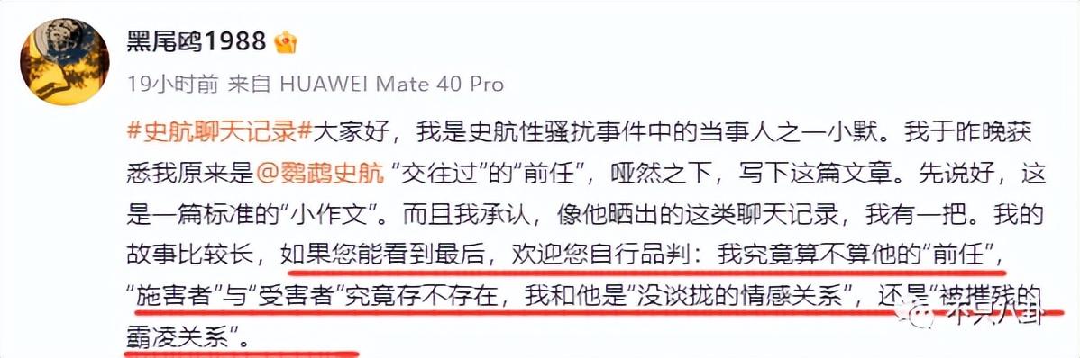 在史航给出部分发声的女孩是其“前任女友”的说法后,其中一位受害者发文回应,她把自己和史航详细的接触过程写了出来,让大家自行评判到底他们算什么关系。