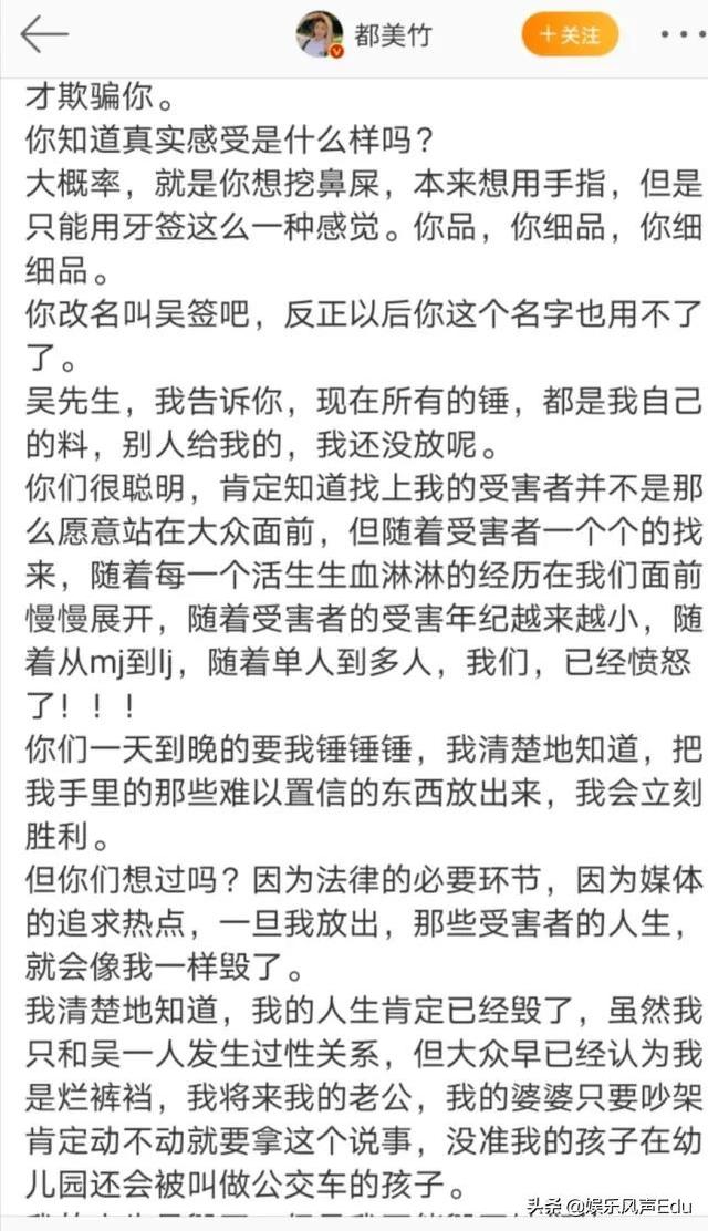 7月,都美竹亲自下场,发多条微博爆料了更多她和吴亦凡之间的事,甚至称两人第一次发生关系时自己还未成年。
