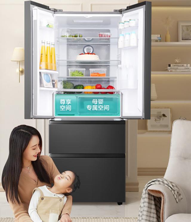 关于开门方式其实没有太多可以聊的,理论上来说门越多,冰箱的保温性会越好,因为门越少,开门的面积会更大,冷气会流失。在购买时比较推荐法式四开门,门的分区合理,底部冷冻区域单一空间足够大,可以存放大型食材,非常方便。