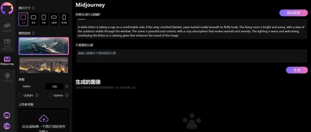 试试Midjourney,输入“一只白色的小猫趴在沙发上”,这时注意到右侧有一个描述联想的按钮,这个功能不错,直接我们把描述扩展了很多细节,供作者调整,但不太理想的是英文,还不能很好支持中文。