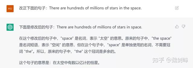 它也可以用来修改英语句子,这点对写作很有帮助。举个例子,There are hundreds of millions of stars in the space. 这句话中冠词的使用是否有问题?你可以输入:“改正下面的句子:There are hundreds of millions of stars in the space.”