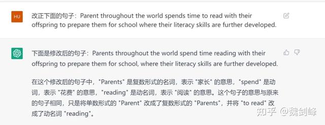 从图中结果可以看到,ChatGPT给出的修改也非常准确。它将parent改为parents(因为可数名词单数不能单独使用,要改为复数或者前面加限定词),将spends改为spend以及将spend time to do something改为正确用法spend time doing something