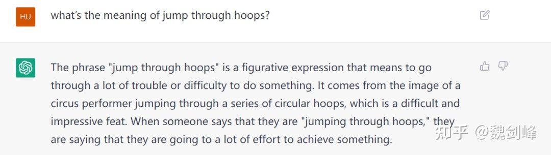 ChatGPT给出了这样的解释:To "jump through hoops" means to do a lot of difficult or complicated tasks in order to achieve something. 并且后面还有详细的使用语境分析,这样更加方便读者理解。