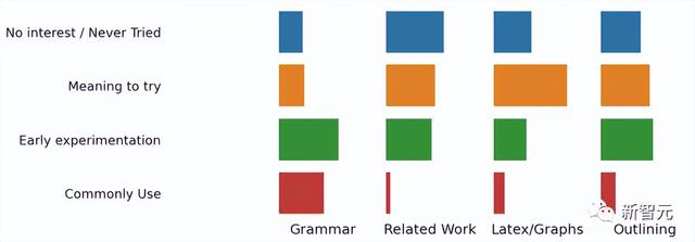 在相关工作调研、Latex图表制作、编写论文梗概上,把LLM当作日常工具的科研人员数量明显降低,不过有很多人表示有意探索LLM在这些领域的用途。
