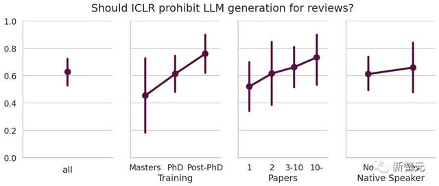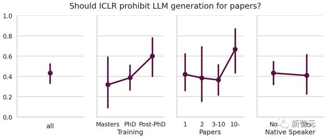 并且在科研界工作更久的群体,如博士、博士后、发表多篇论文的研究人员也更倾向于禁止LLM审稿。