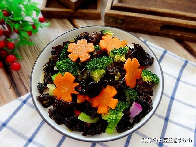 准备食材:胡萝卜、泡发木耳、西兰花、量的多少自己把握就好,喜欢吃哪一样就多放点。西兰花掰成小朵,用淡盐水浸泡20分钟后冲洗干净,烧开水煮2分钟左右就可以捞出控水;黑木耳提前用冷水泡发,摘洗干净后煮5分钟左右捞出;胡萝卜切片煮熟。