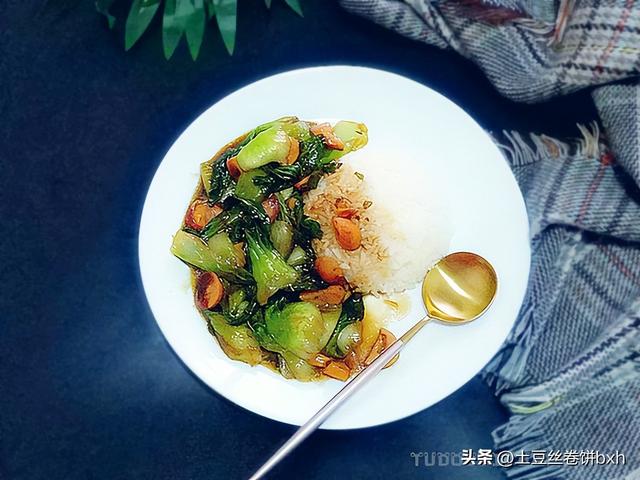 做法:油菜洗干净,烧开水,放一点盐,水开后放入油菜,看到油菜发蔫了就捞出过凉;玉米肠切丁,备点葱花;蚝油半汤勺,酱油半汤勺,在放入半碗的水搅拌均匀,口重的可以适当放点盐;炒锅烧热油,先把玉米肠炒出微焦的表皮状;放入油菜翻炒,全程大火,倒入备好的料汁,炒匀,看到料汁烧开起泡状,勾芡出锅,浇在米饭上即可。