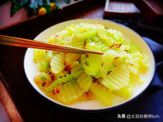 做法:莴笋切片,水烧开,放入莴笋,然后再次烧开就可以捞出过凉后控去水,不要过久地煮,莴笋本身是可以生吃的,焯水一下就是起到消毒杀菌的作用;用盐、白醋和糖先把莴笋拌匀,上面放入切碎的香葱,在香葱上再放一勺辣椒粉;锅内烧两勺食用油,烧到冒烟的状态,端起锅把热油浇到辣椒粉上;拌匀、静置几分钟再翻拌几下就可以吃啦,特爽,清脆可口。