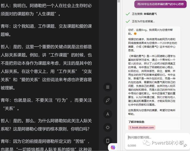 这点先前也介绍过,市面上已经有了很多产品,chatpdf、chatdoc等等,这些体验确实比New Bing的体验要好,但是你要四处找想要的电子版的文档,而使用New Bing+微信读书就完美的解决了这个问题。虽然最近微信读书的吃相有些难看,但确实是目前国内出版书籍中最方便的阅读器。